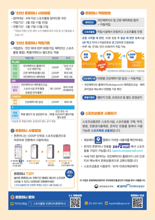튼튼머니 적립시설에서 30분이상 운동하고 큐알코드 인증하면 스포트활동 참여 포인트 1,000포인트가 적립니다.
