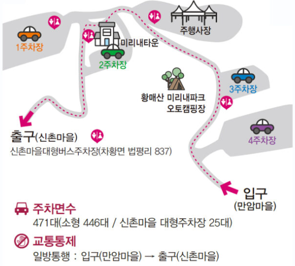 - 주말 및 공휴일 한정 합천터미널 ↔ 황매산 순환 셔틀 운행 (무료)