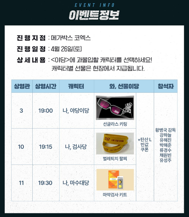 | 2025.04.27 (토) | 13:00 / 16:00 | CGV 왕십리 / 메가박스 강남 | 강하늘, 박해준 |