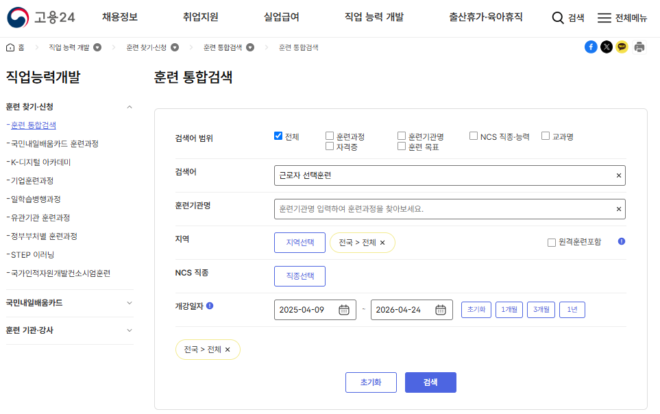 - 검색 창에 관심 있는 분야나 키워드를 입력하여 원하는 훈련 과정을 검색합니다.